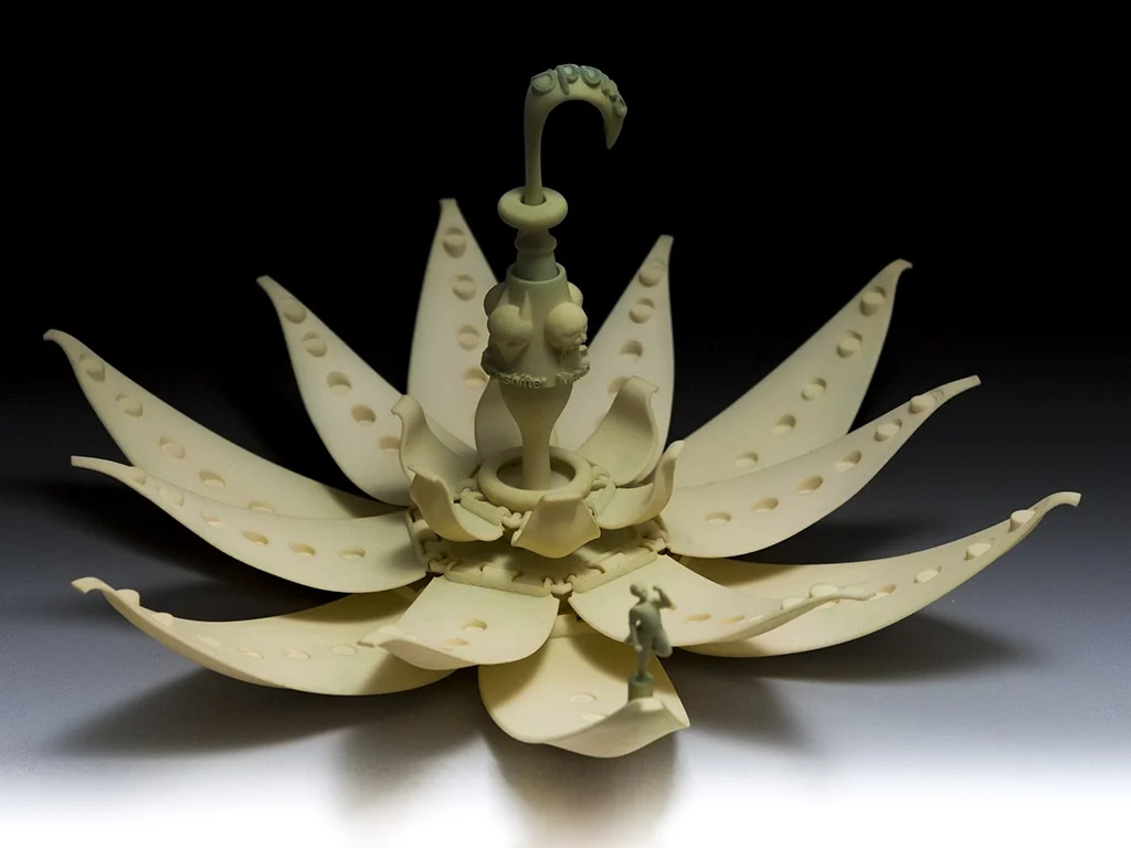 ~Packaging: Spolia was designed with packaging in mind. The game board folds up and is held in place by sliding rings on the center handle. The playing pieces can fit in between the petals so they are not lost. Also, there is space in the bottom of the board that can store the cards. The entire game can then be lifted by the top handle and carried to its next destination. For shipping and store display I suggest that the game can be sealed with a plastic wrap around it to make sure it cannot be opened before purchase.