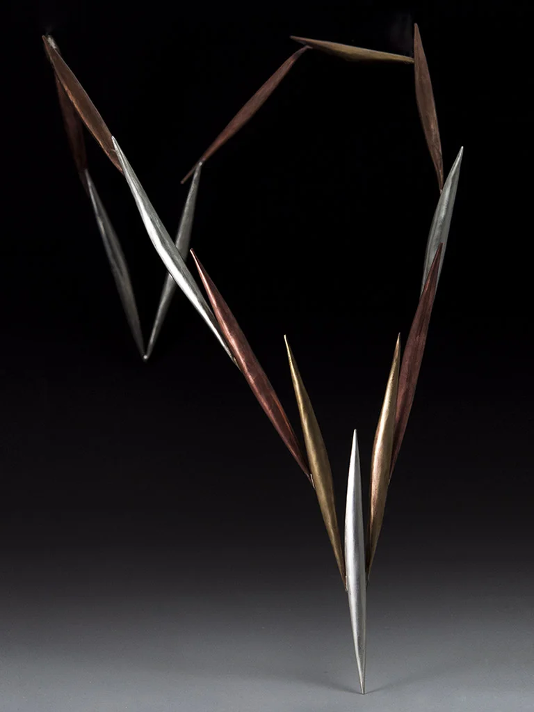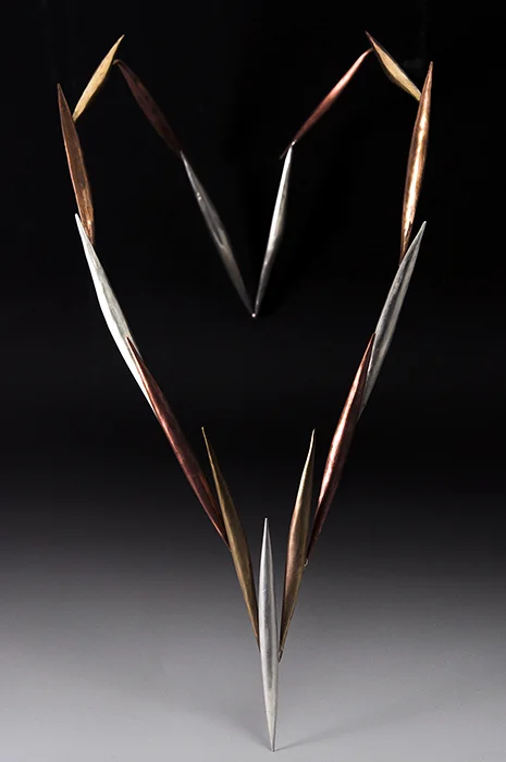 This piece is made up of multiples of the spiculum form. Using all different types of metal, I made 22 spiculums, in order to become familiarized with the form. Once I had many to work with, I decided to make a neckpiece. I did some research and I decided to base it off the Aesop tale of Androcles and the Lion. In a way I took the one thorn and arrayed it around to create a lion mane of thorns.